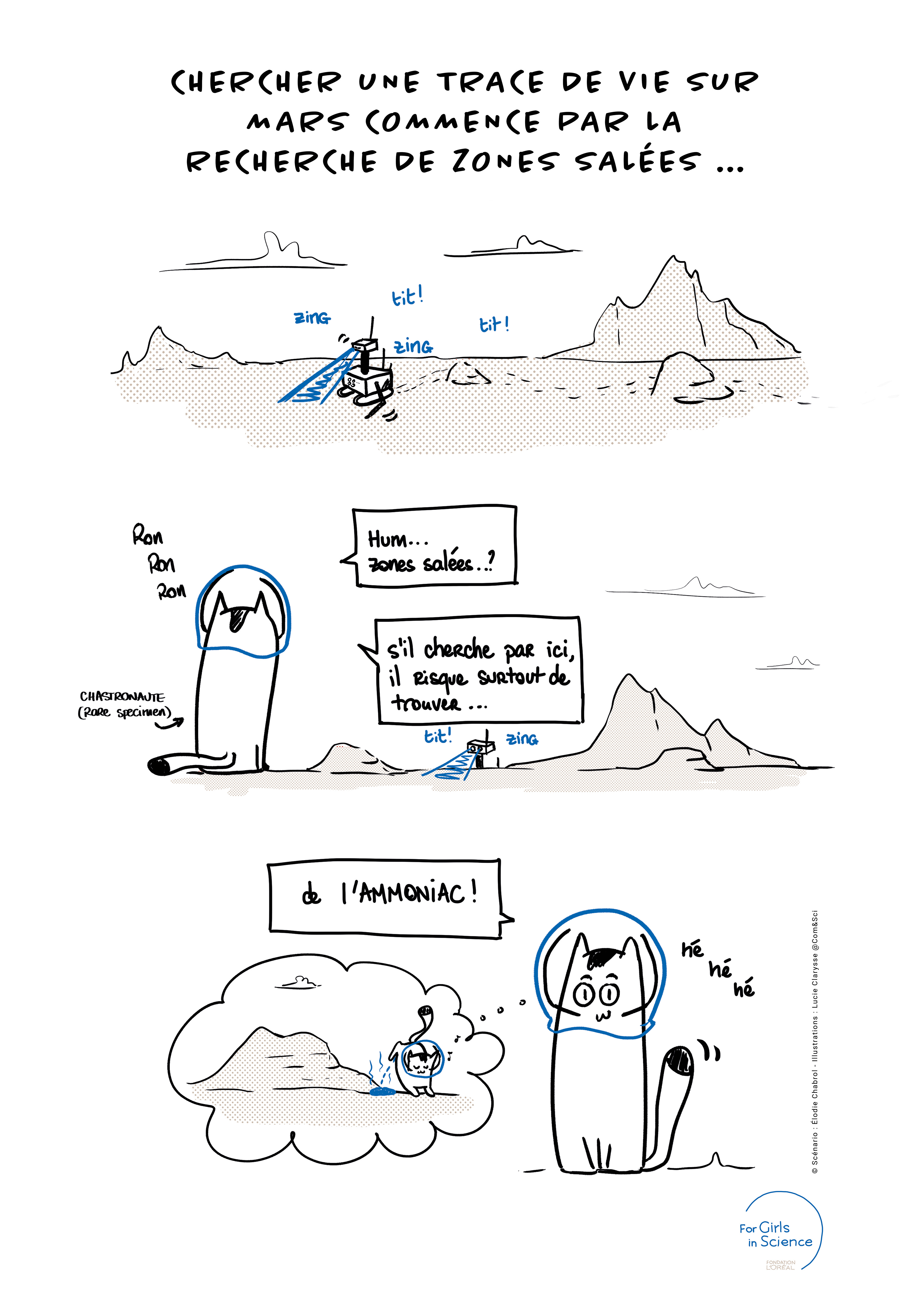 Réalisation de 35 BD illustrant avec humour les thématiques de recherche des 35 lauréates du For Women In Science de La Fondation L'Oréal, pour une exposition à la cité des Sciences - Paris. Textes écrits par Elodie Chabrol.